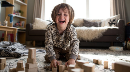 A cheerful boy is joyfully playing with wooden blocks on a plush rug, surrounded by a bright and cozy living room that radiates warmth and creativity.