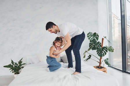 Happy father with his daughter have fun at home together.