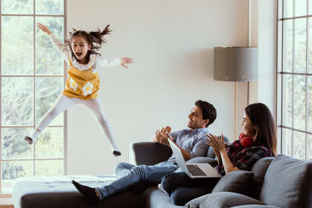 Three members of diverse family, Caucasian father, Asian mother and little half daughter spend time together in house living room. Girl jumping on sofa while mom and dad working at home and cheer up.