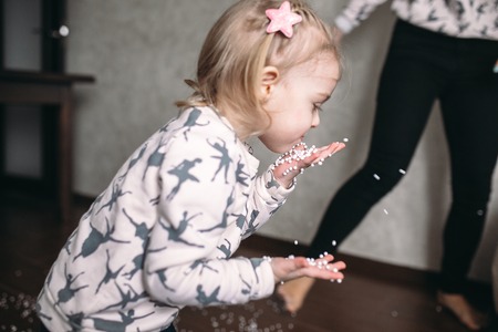 Little girl is playing with foam balls