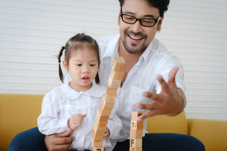 Asian Father spending times with his daughter to playing toys together.
