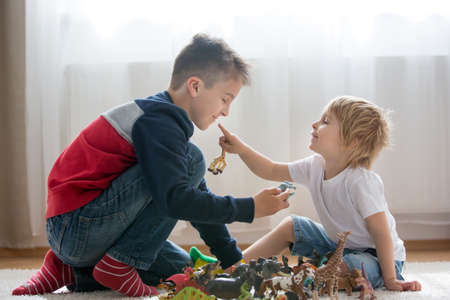 Blond child, toddler boy and his older brother, preteeen boy, playing with plastic animal toys at home, soft back light