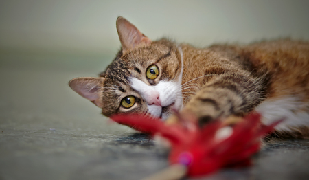 Domestic striped cat lies on a floor with a toy.