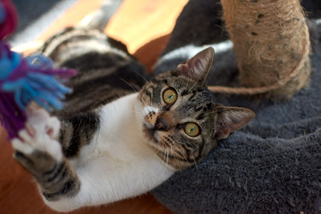 Tabby cat (gray and white color) playing with a handmade toy