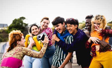 Happy young diverse friends having fun with old vintage video camera outdoor - Youth people millennial generation concept