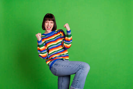 Photo of happy young nice victorious young woman winner celebrate lucky lady isolated on green color background