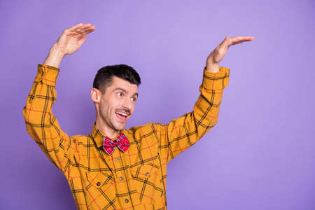 Photo of funky charming young man wear plaid shirt bow tie dancing looking empty space isolated violet color background