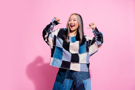 The cute young Asian girl with casual clothes standing on the purple background.