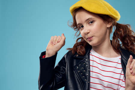 beautiful girl with a black jacket and a yellow hat on her head red hair model blue background