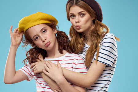 Two girlfriends striped T-shirts fashion emotions communication conflict quarrel