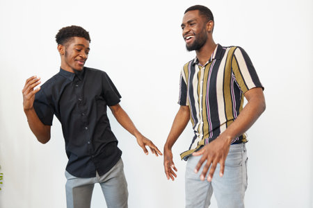 Two young black men with dark skin dancing and smiling together in casual clothes against white background. Friends enjoying music and having fun in relaxed atmosphere indoors.