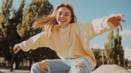 A cheerful young woman enjoying a sunny day outdoors while playfully balancing on a skateboard in a park
