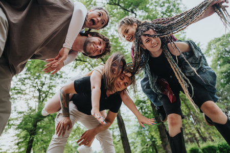 Group of friends having fun together outdoors in a park setting