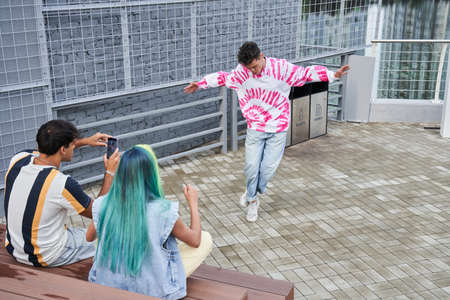 Happy modern people making video story for social network app outdoor