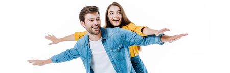 happy young couple in denim with open arms isolated on white, panoramic shot