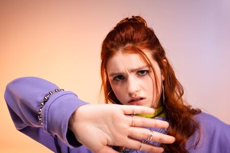 redhead teen girl in bad mood with stop gesture, on purple and beige