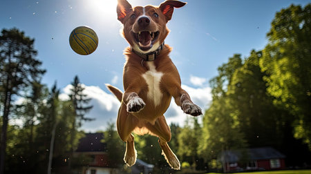 A playful dog is eagerly running in the backyard, chasing after a ball. The sun shines brightly, and the home is seen in the background, creating a joyful scene.