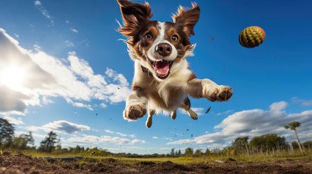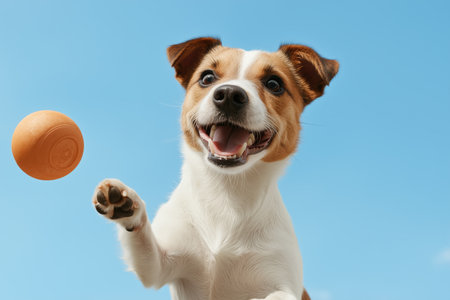 Playful Jack Russell terrier jumping to catch a ball with blue sky background. Joyful activity and pet interaction.