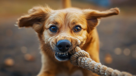 Playful golden retriever enjoying a game of tug-of-war with a rope outside during a sunny afternoon in a park