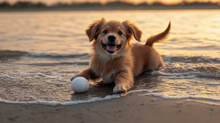 Happy Golden Retriever Puppy Playing with Ball at Sunset on Beach with Ocean Waves Glistening Under Warm Golden Light in Calm Evening Atmosphere