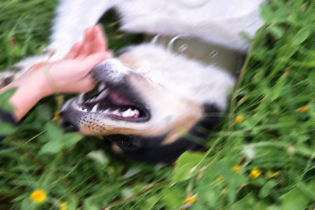 An aggressive dog wants to bite a person's hand, animal rabies.