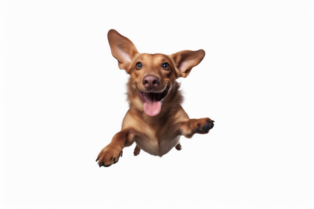A happy dog runs towards the camera on a solid white background, ears perked up and tail wagging with a joyful expression. Its excitement and happiness are palpable in this dynamic moment.