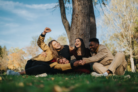 Group of friends having fun together outdoors in a park setting