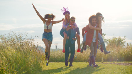 Group Of Young Friends Giving Each Other Piggyback Rides As They Walk Through Music Festival Site