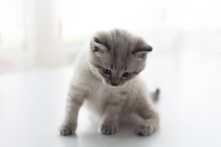 Fluffy white kitten. Cute, beloved, beautiful kitten close-up. Portrait of a cat. Scottish Straight Kitty in a natural setting at home.