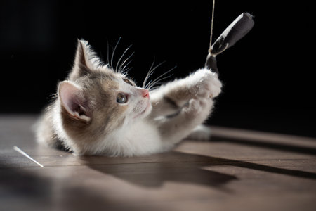 2 months old ragdoll kitten playing with a cat teaser. domestic cat