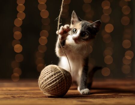 cute small lovely curious baby cat or kitten with white color spotted fur and whiskers playing with thread on twig near straw basket wooden background outdoor