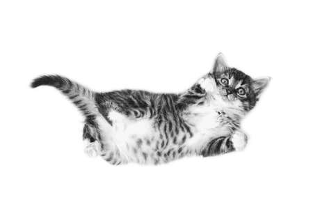 little cute grey furry scared kitten lying on its side isolated on white background black and white photo