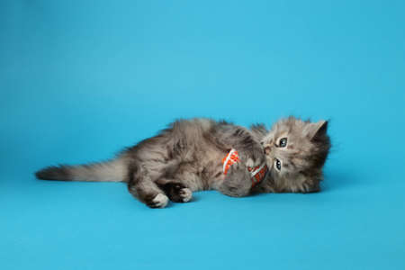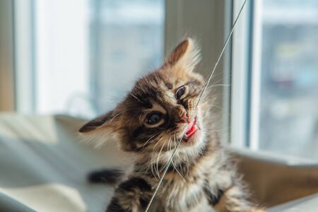 little striped playful kitten playing blue ribbon on bed at home. Looking into the camera. Healthy adorable domestic pets and cats