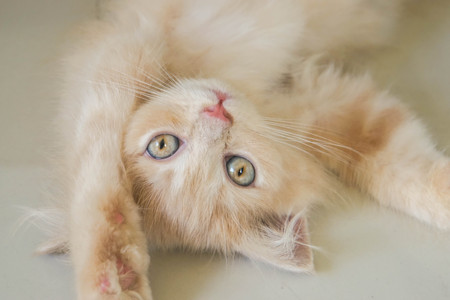 Portrait of lying playful ginger cat kitten on the floor, indoors
