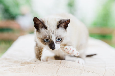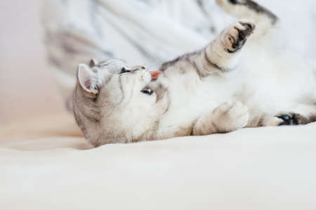 A little striped kitten playing on a beige blanket and catching something with her paws, hunting.