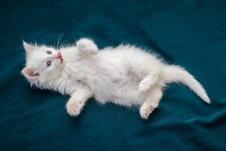 A cute white fluffy kitten with multicolored eyes and a protruding tongue lies on the back on a green blanket