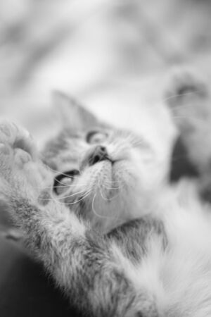 Happy kitten enjoys lying on the carpet. Lovely domestic animals. BW photo.