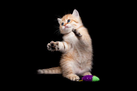 Kitten playing standing on its hind legs, red playful kitten funny standing on its hind legs next to the toy on a black isolated background, cute Golden British kitten.