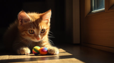 Cute ginger kitten playing with colorful balls on the floor. Selective focus.