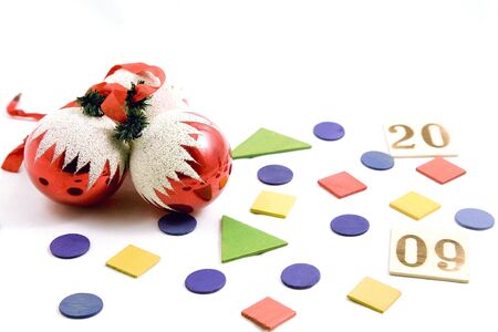 decorative balls and coloured pices and wooden pieces with numbers drawn, isolated on white