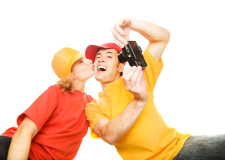 Young couple photographing themselves