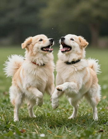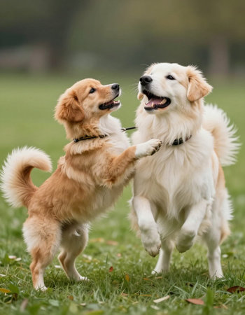 Two Golden Retriever dogs having fun in the park on a sunny day.