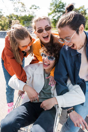 multiethnic friends laughing near man sitting in shopping trolley
