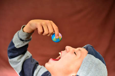 The boy holds the planet earth in his hands and wants to eat it, on a red background