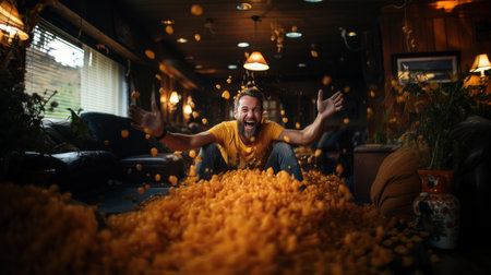 Trampoline and confetti Midair shot of handsome young man jumping on trampoline with confetti all around him : Generative AI