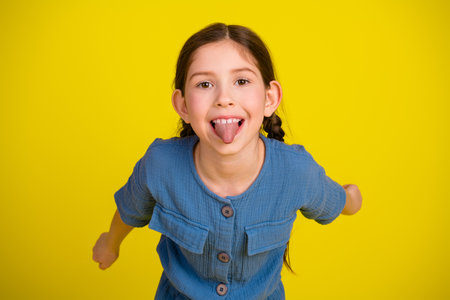 Charming young girl posing playfully against a vibrant yellow background, with happy gestures and a cheerful expression