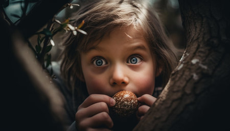 Smiling girl holding fruit, enjoying nature beauty generated by artificial intelligence