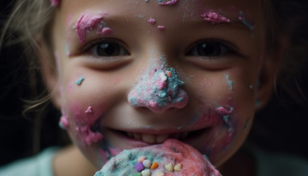 Cute Caucasian girl enjoys messy chocolate candy at birthday party generated by artificial intelligence
