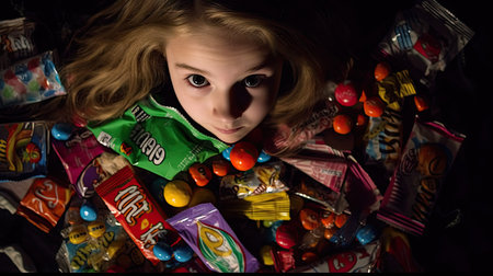 a young girl surrounded by candy and candis, with the capt ` ` ` ` ` ` ` ` ` ` ` ` ` ` ` ` ` ` ` ` ` ` ` ` ` ` ` ` ` ` ` ` ` ` ` ` ` `