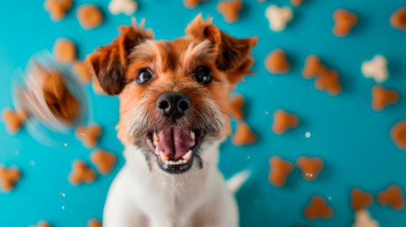 A cheerful dog with a joyful face is sitting among colorful dog treats. Its happy demeanor shows pure excitement and playful anticipation in a bright setting.